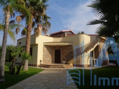 AM050 - Altavilla Milicia (PA) - In Zona Residenziale, Lussuosa Villa Unifamiliare di mq.300 circa su 2 livelli, insistente su una superficie esterna di mq. 1000, con giardino con prato inglese e piante esotiche, schermata dall’esterno da una fitta vegetazione, fornita di piscina con effetto mosaico, bordo a sfioro, scala romana ed idromassaggio, zona solarium, doppio portico esterno coperto, dependance esterna con spogliatoio con annesso w.c. doccia e lavanderia, angolo barbecue. La villa internamente é composta da: Piano Terra: ingresso su ampio salone soggiorno con caminetto e scala a vista, cucina abitabile con angolo cottura in muratura e sfoghi esterni sui 2 porticati, cameretta, w.c. doccia, disimpegno con annesso armadio a muro, secondo disimpegno con accesso ad una camera da letto matrimoniale, cameretta, w.c. doccia e ripostiglio, la pavimentazione è interamente parquettata; Piano Primo accessibile sia dall’interno che da una scala esterna risulta composto da: ingresso da terrazzino esterno su ampio soggiorno con tetto rustico con capriate in legno ed ampia vetrata vista mare e sfogo su pergolato laterale con ampia vista mare e sul golfo di Capo Zafferano, n° 2 camere da letto in mansarda con relativi servizi con doccia all’interno. Inoltre l’immobile risulta essere fornito di impianto d’allarme, videosorveglianza, porta blindata, porte scorrevoli, infissi esterni in legno alluminio con vetri camera a taglio termico, zanzariere, riscaldamenti autonomi e climatizzatori in tutti gli ambienti, videocitofoni, l’impianto della piscina risulta interamente automatizzato, impianto di irrigazione del prato temporizzato, ecc., ubicato in zona residenziale recentemente metanizzata.